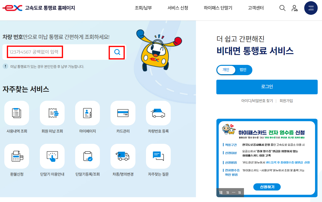 고속도로통행료 미납조회 1. 고속도로통행료 홈페이지 메인화면 - '차량번호' 입력