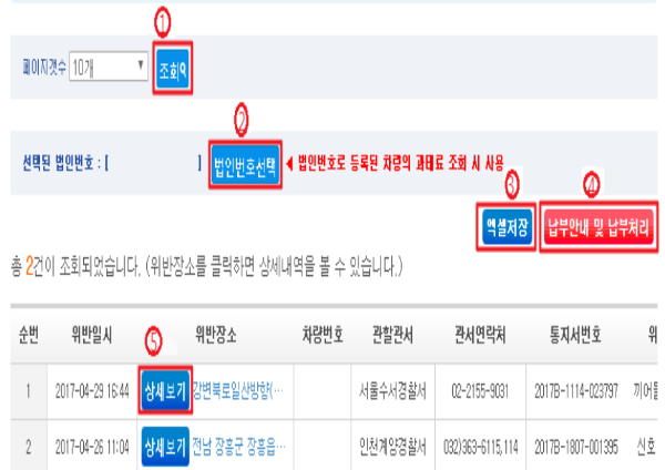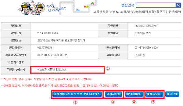 1. '조회'는 최근 무인단속내역 내용을 페이지별로 조회할 수 있습니다.