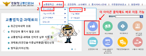 과속단속조회 실시간 1. '교통범칙금·과태료' - '미납내역조회' - '최근단속내역'