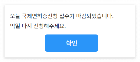 하루에 국제운전면허증 발급 가능자 수가 한정적이기 때문에 아래 사진처럼 내일 다시 신청하라고 할 수 있습니다. 그러니 필요한 날에 급박해서 발급하려고 하면 안 되겠죠? 시간 여유 있을 때, 미리미리 발급해두세요!!