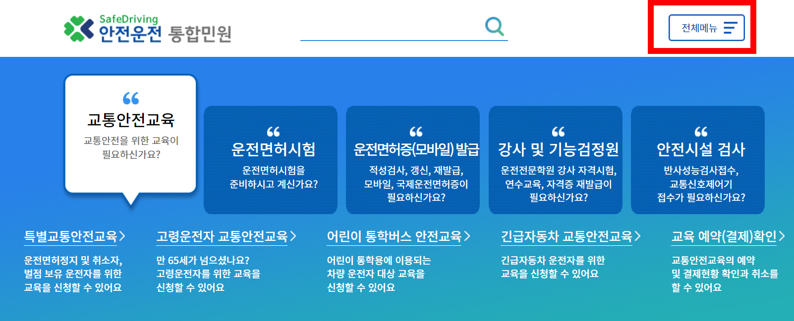 운전면허증갱신 인터넷신청 1. 안전운전통합민원 홈페이지 - '전체메뉴'