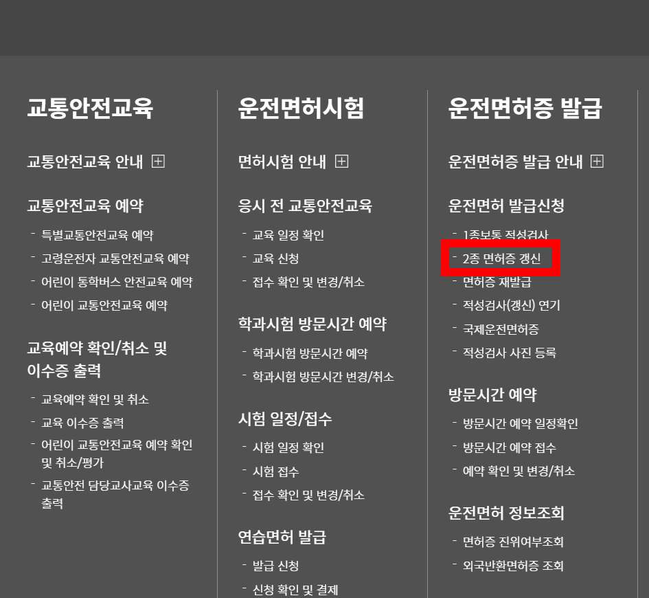 운전면허증갱신 인터넷신청 2. 1종, 2종 운전면허증갱신 신청방법 차이