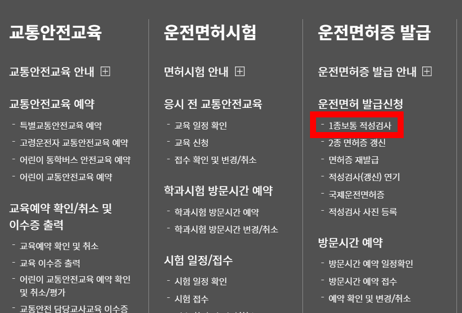 도로교통공단 홈페이지 - 안전운전통합민원 - '전체메뉴'의 순서를 따라오시면 됩니다.